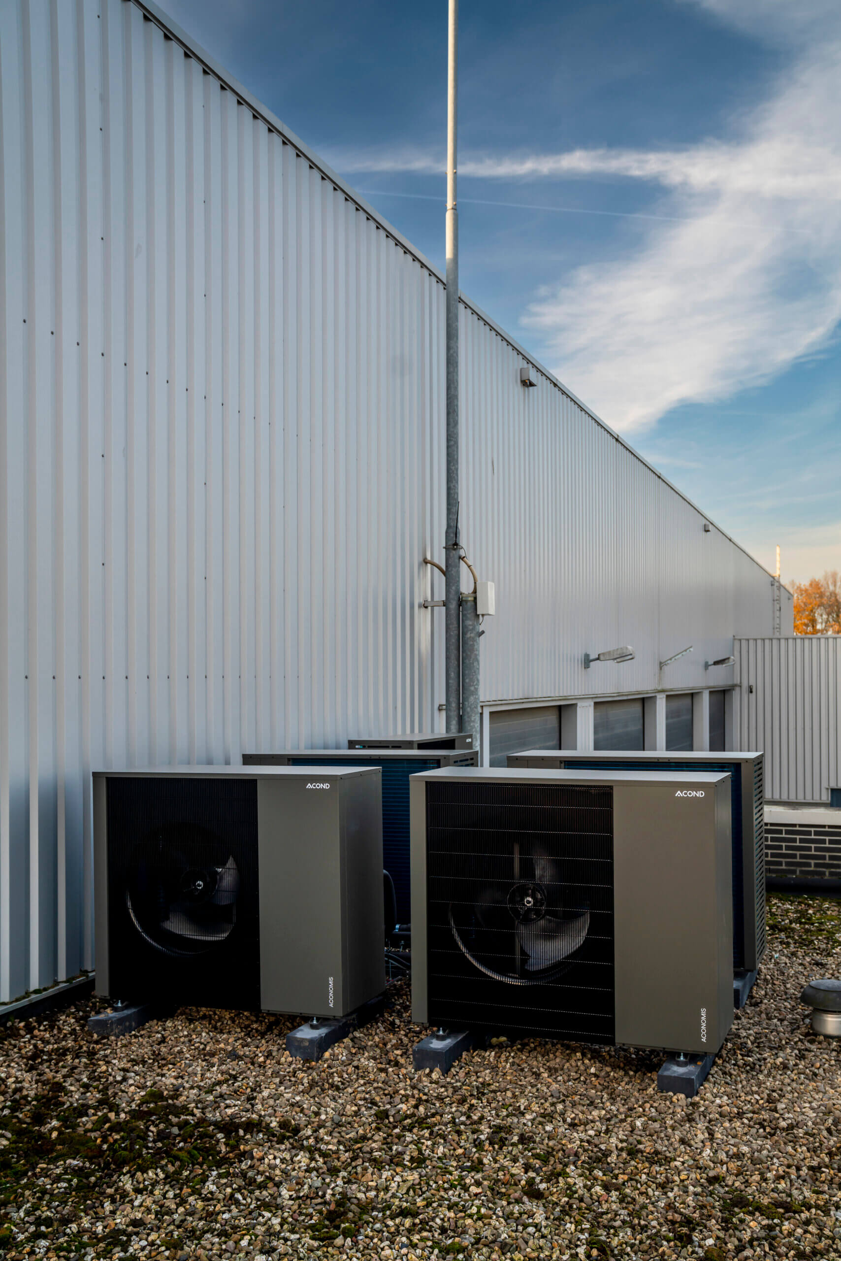 Wij hebben vijf Acond Aconomis warmtepompen geplaatst die samen zorgen voor een efficiënte en stabiele warmtevoorziening voor het bedrijfspand. Door meerdere warmtepompen in cascade te laten samenwerken, kan het systeem flexibel inspelen op de warmtevraag en blijft het rendement hoog.